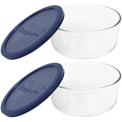 Pyrex Storage 4-Cup Round Dish with Dark Blue Plastic Cover, Clear (Pack of 2 Containers)