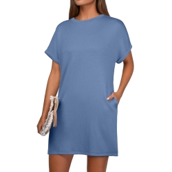 GRECERELLE Women’s 2025 Summer Short Sleeve Crew Neck Casual Mini Tee Shirt Dress with Pockets Denim Blue, Large