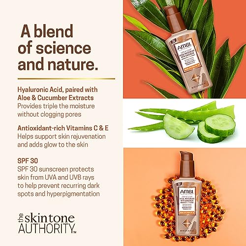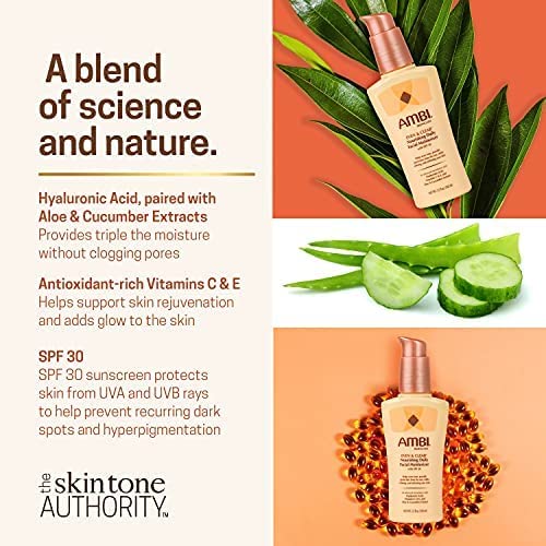 Details: Ambi Even & Clear Nourishing Daily Facial Moisturizer combines natural extracts, proteins, and vitamins to refine, soften and help even skin tone. It is specifically formulated with Hyaluronic Acid paired with Aloe and Cucumber Extracts, which provide triple the moisture without clogging pores and antioxidant-rich Vitamins C & E, which rejuvenate and add glow to the skin. Our organic SPF 30 formula, unlike the mineral formulas; it does not leave white / ashy cast on melanin-rich skin. It statistically performs better on consumer skin protection longevity tests. Paraben-free, Phthalate-free and fragrance-free.