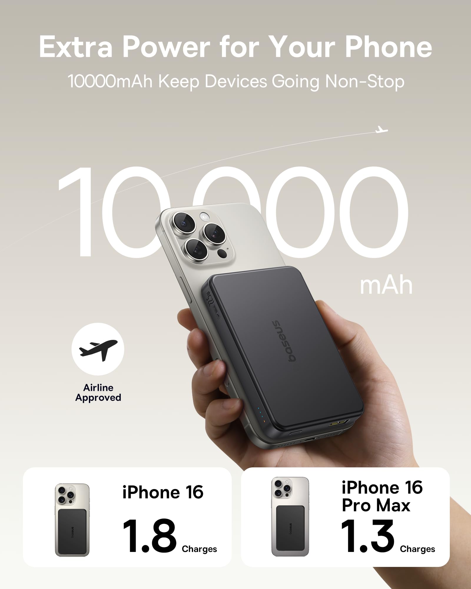 - ✅【𝐀𝐥𝐥-𝐝𝐚𝐲 𝐖𝐨𝐫𝐫𝐲-𝐟𝐫𝐞𝐞 𝐏𝐨𝐰𝐞𝐫】10,000mAh portable -sized battery can charge your iphone 15 or Samsung S24 for 1.8 times. This magnetic power bank provides multiple charges throughout the day, ready for use wherever you are. It is allowed to be taken on the plane. Ideal for business trips, vacations, shopping or outdoor sports activities.