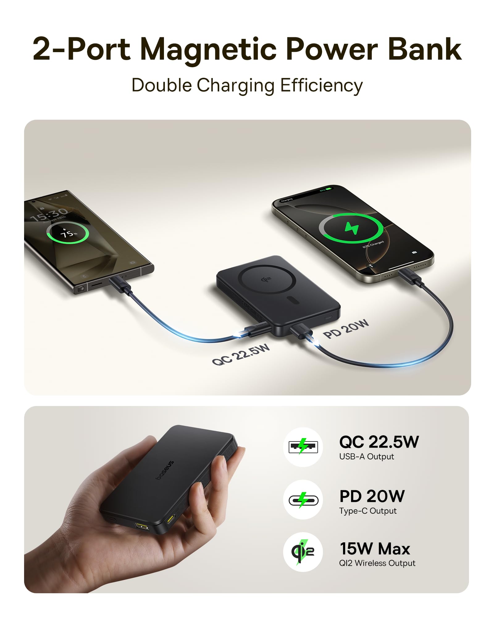 - ✅【𝐃𝐮𝐚𝐥 𝐅𝐚𝐬𝐭 𝐂𝐡𝐚𝐫𝐠𝐢𝐧𝐠 𝐏𝐨𝐫𝐭𝐬】Other MagSafe Battery Pack only have ONE USB-C port, by contrast, our QI2 MagSafe battery pack comes with 2-Port: 1*22.5W USB-A and 1*20W USB-C. Supports wired charging for up to two devices simultaneously. Offering versatile charging options for your Phones, Pads, and other devices.