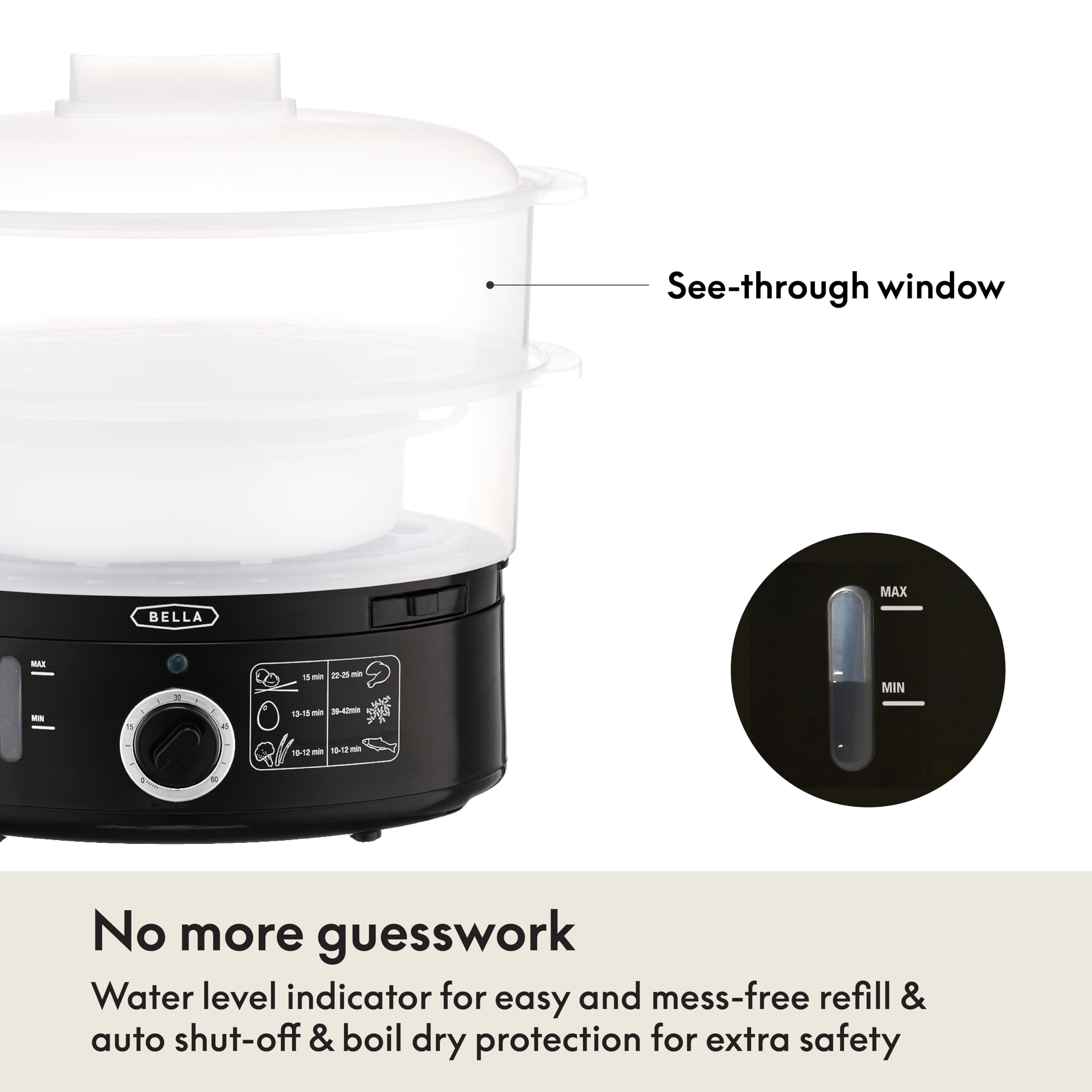 - EASY TO READ WATER LEVEL INDICATOR: No more guessing when it’s time to refill your water! BELLA’s vegetable steamer is equipped with a clear water level indicator that tells you exactly how much liquid is left so you can refill the steamer pot comfortably