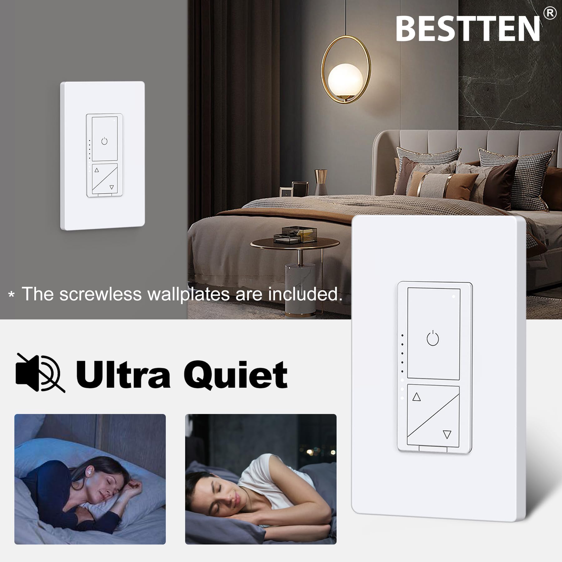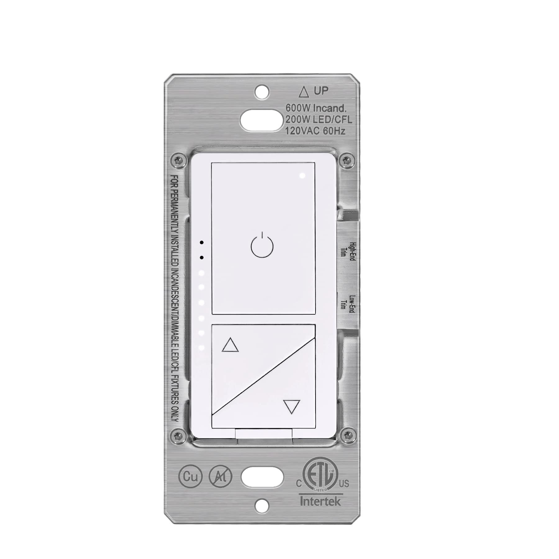 - 8 LED brightness indicator lights show brightness level right on the dimmer. Screwless wall plates included