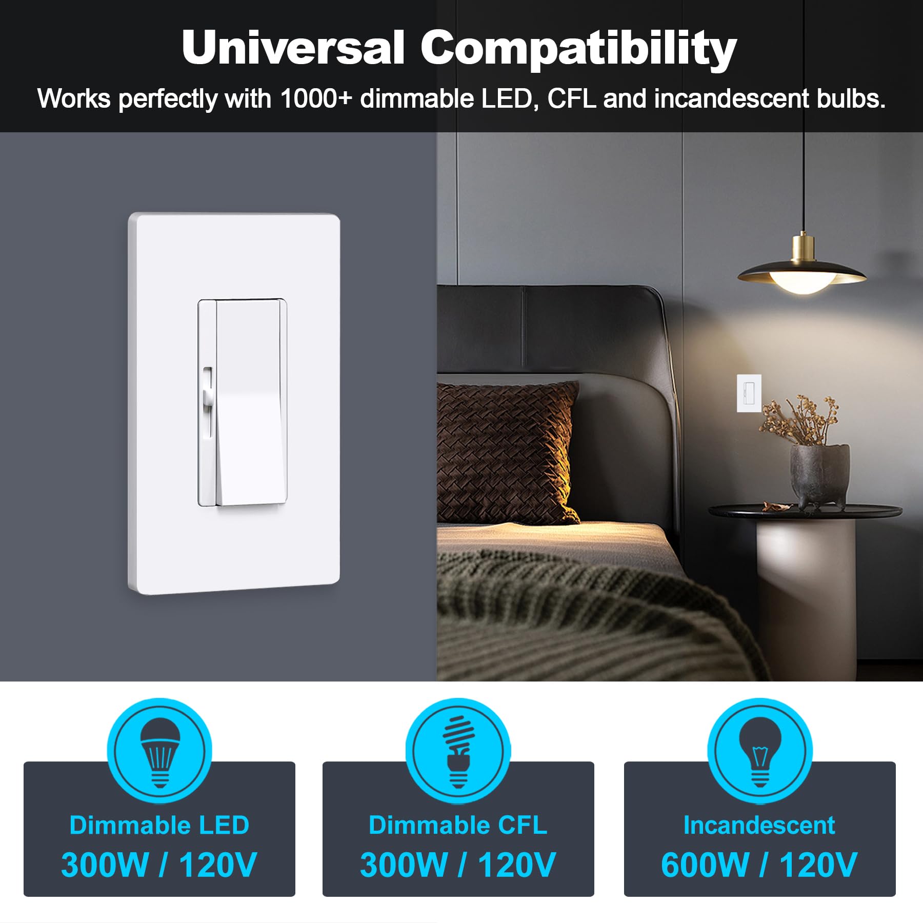 - 【Universal Compatibility】Works with dimmable LED, CFL up to 300W, Incandescent & Halogen light lamp bulbs up to 600W. 15A/120V/60Hz, ETL certified
