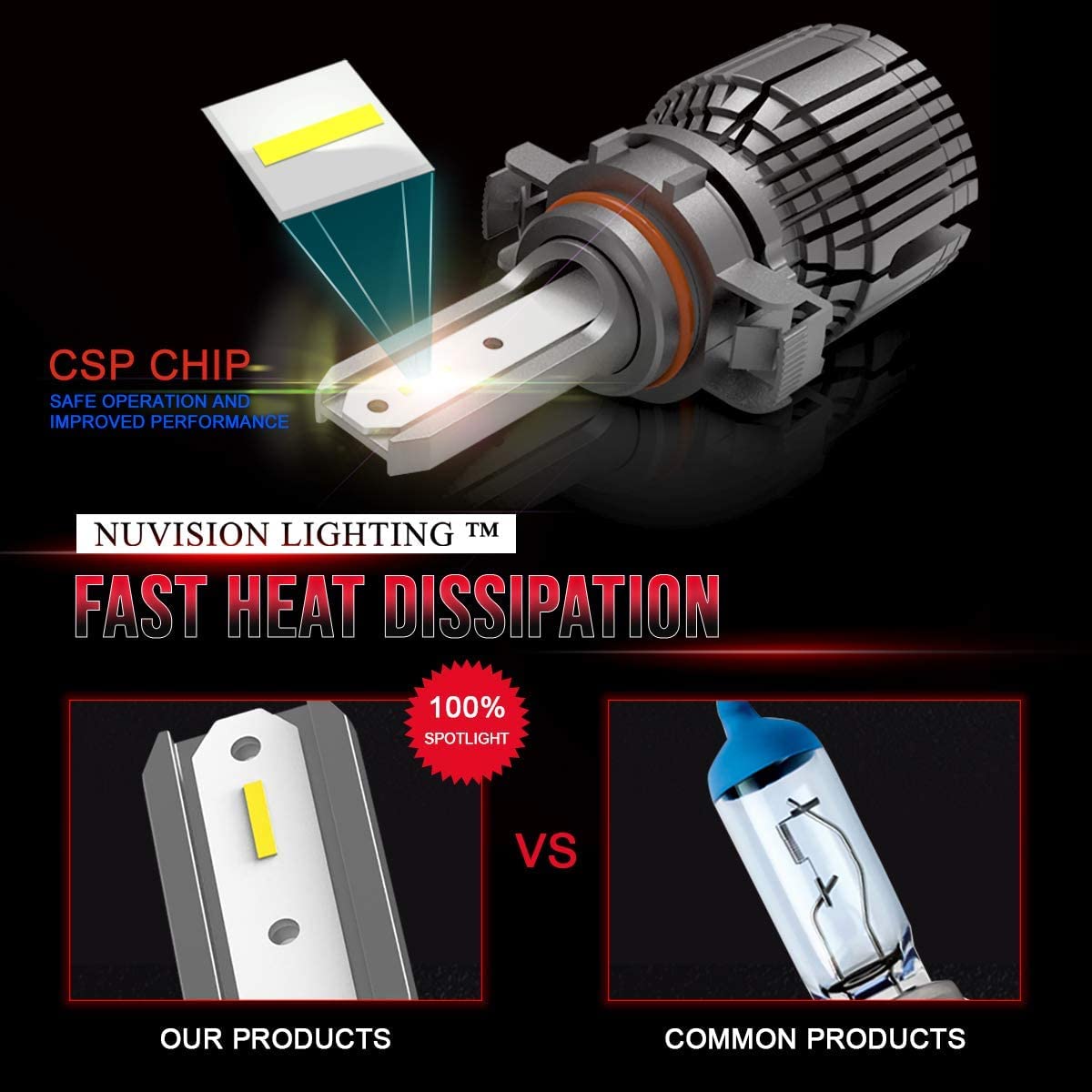 - 【300% Brighter Than Normal Halogen】 High luminous efficacy CSP chips with 30W each bulb, Luminous Flux: L/5000 Lumens, H/5000 Lumens each bulb making them the brightest headlights bulbs. The classical design helps light concentration and ensures maximum light output, without blinding or dazzles oncoming traffic. The latest LED technology with CSP chips extended the lifespan to 20 years even with 4 Hrs driving every night, free from future replacement. Operating Temperature ranges from -40°F to 80°F with fast lighting time than normal light bulbs. IP65 Waterproof Rate.