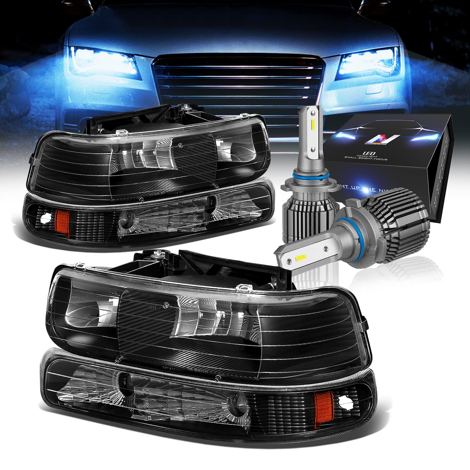 DNA MOTORING HL-OH-CS99-4P-BK-AB-CFS-9006 Black Housing Amber Reflector Headlights Compatible with 99-02 SIlverado HD 00-06 Suburban Tahoe With Pair 9006 HB4 10000 Lumens 60W LED Bulbs