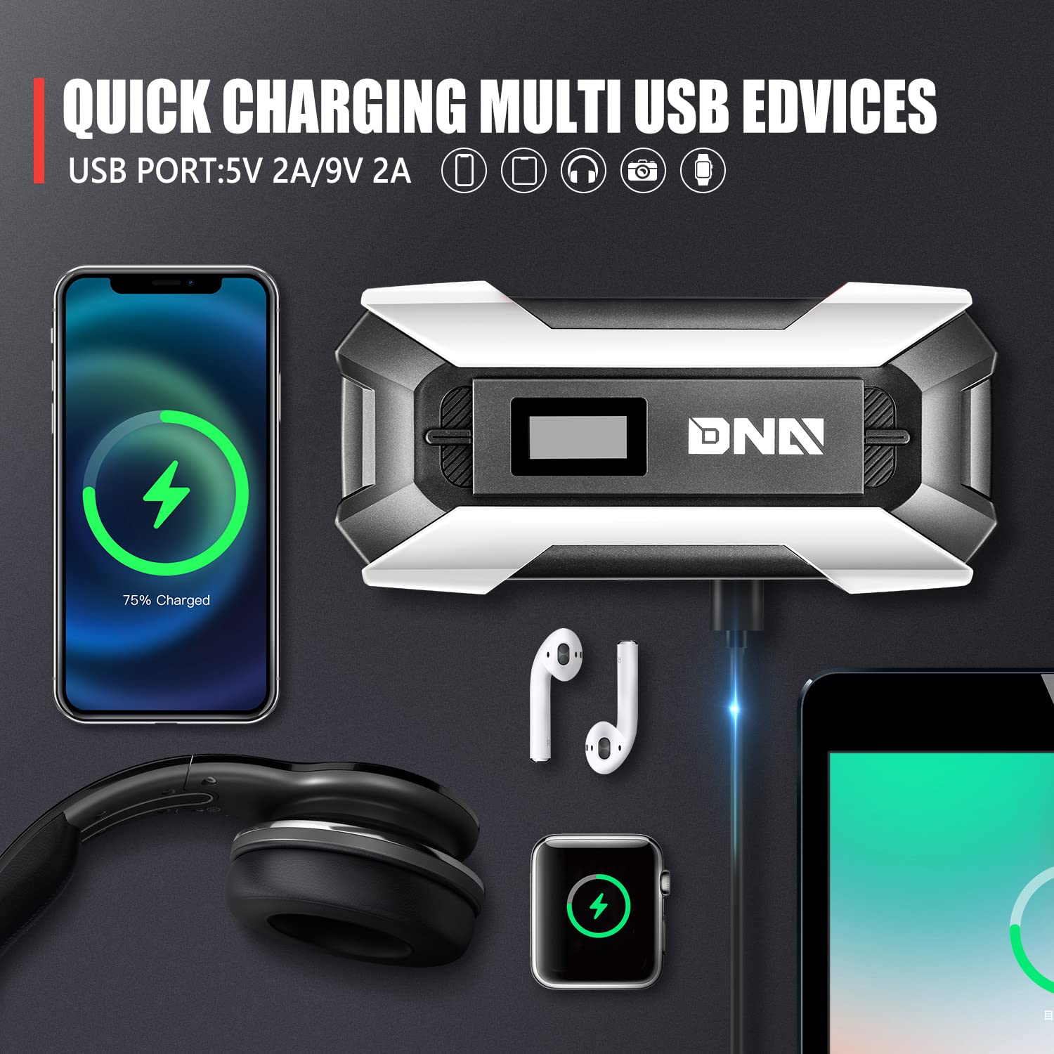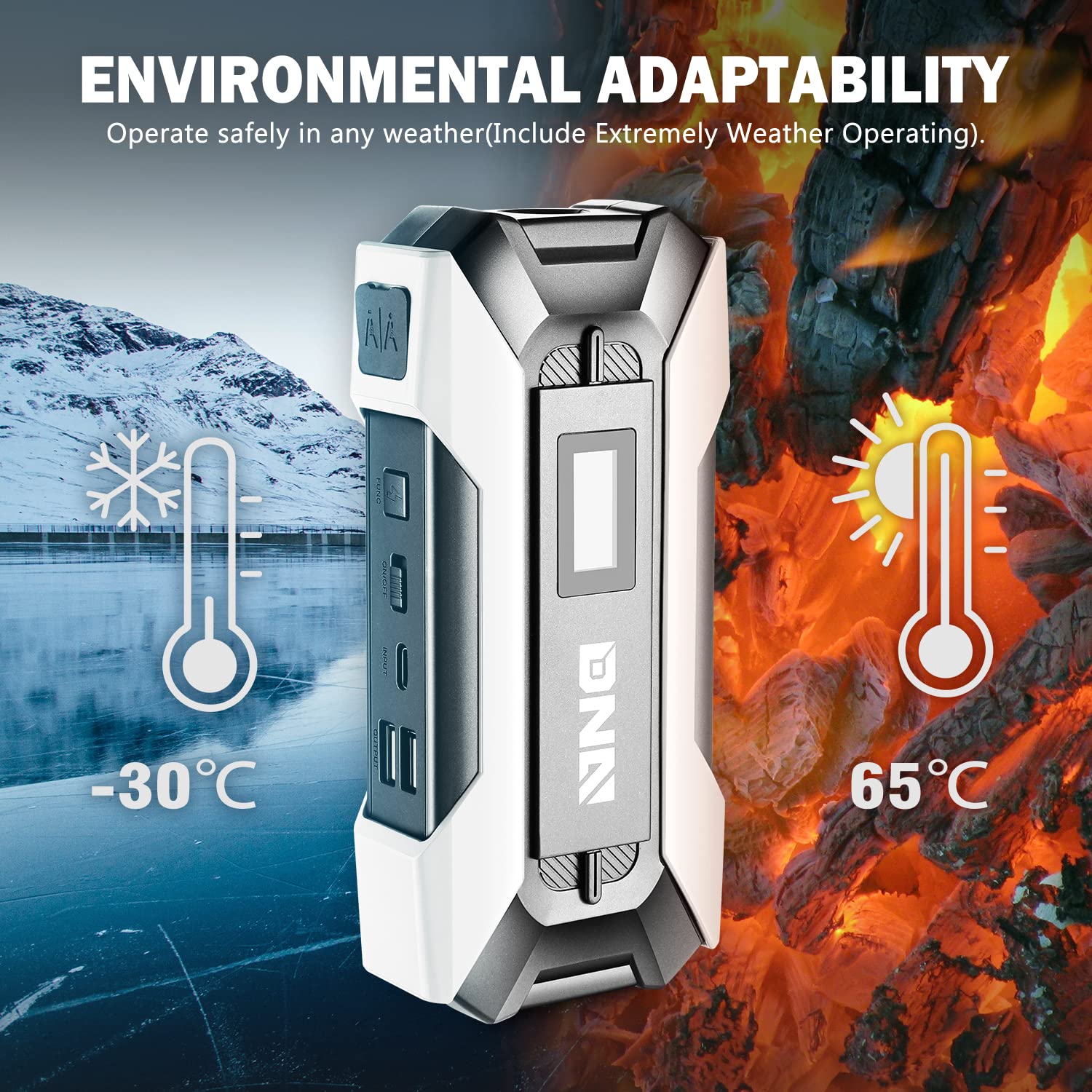 - PRODUCT SPECIFICATIONS – Size : 175*82*42mm / Peak Current : 1500A / Capacity : 15000 mAh / Applicable Models : 12V / Starting Curent : 600A / Input : 5V 2A/9V 2A / USB Port : 5V 2A/9V 2A / Applicable Temperature : -30℃ to 65℃