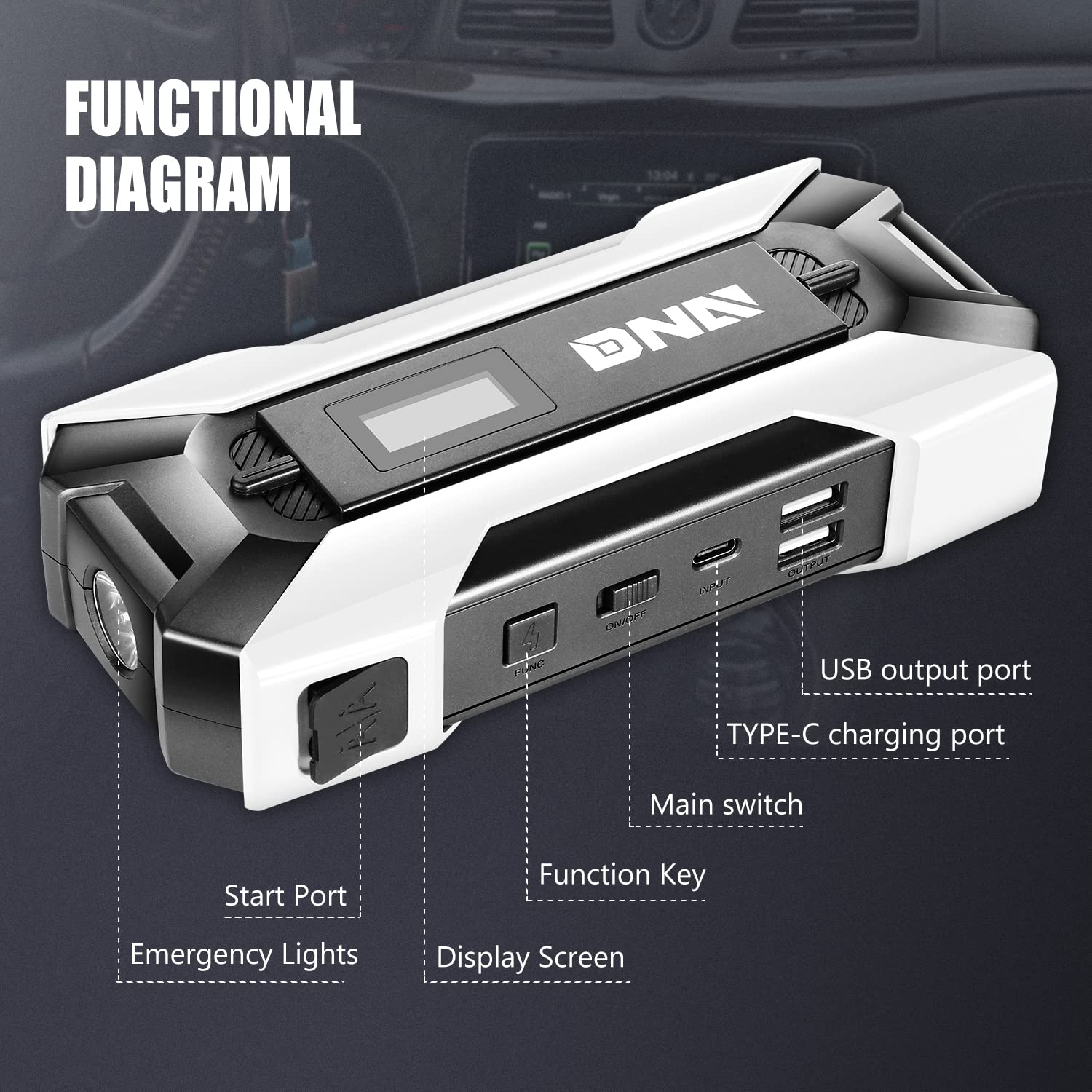 DNA MOTORING TOOLS-00269 12V 1500A 15000 mAh Multi-Function Portable Car Battery Jump Starter for Up to 7.0L Gas & 5.5L Diesel Engine, with Carry Case, White