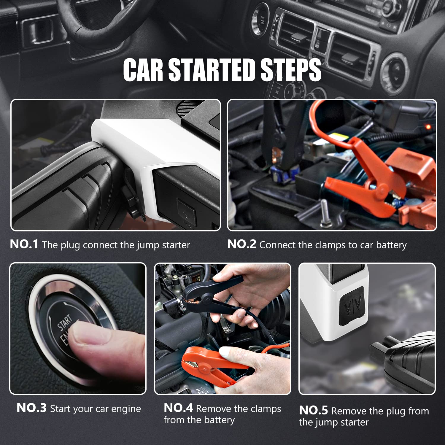 - POWERFUL CAR JUMP STARTER – With a 1500A peak current, this car jump starter can start the 12V vehicles up to 7.0L Gas/5.5L Diesel engines in seconds. Suitable for cars, SUVs, trucks, vans, motorcycle or boat and so on.