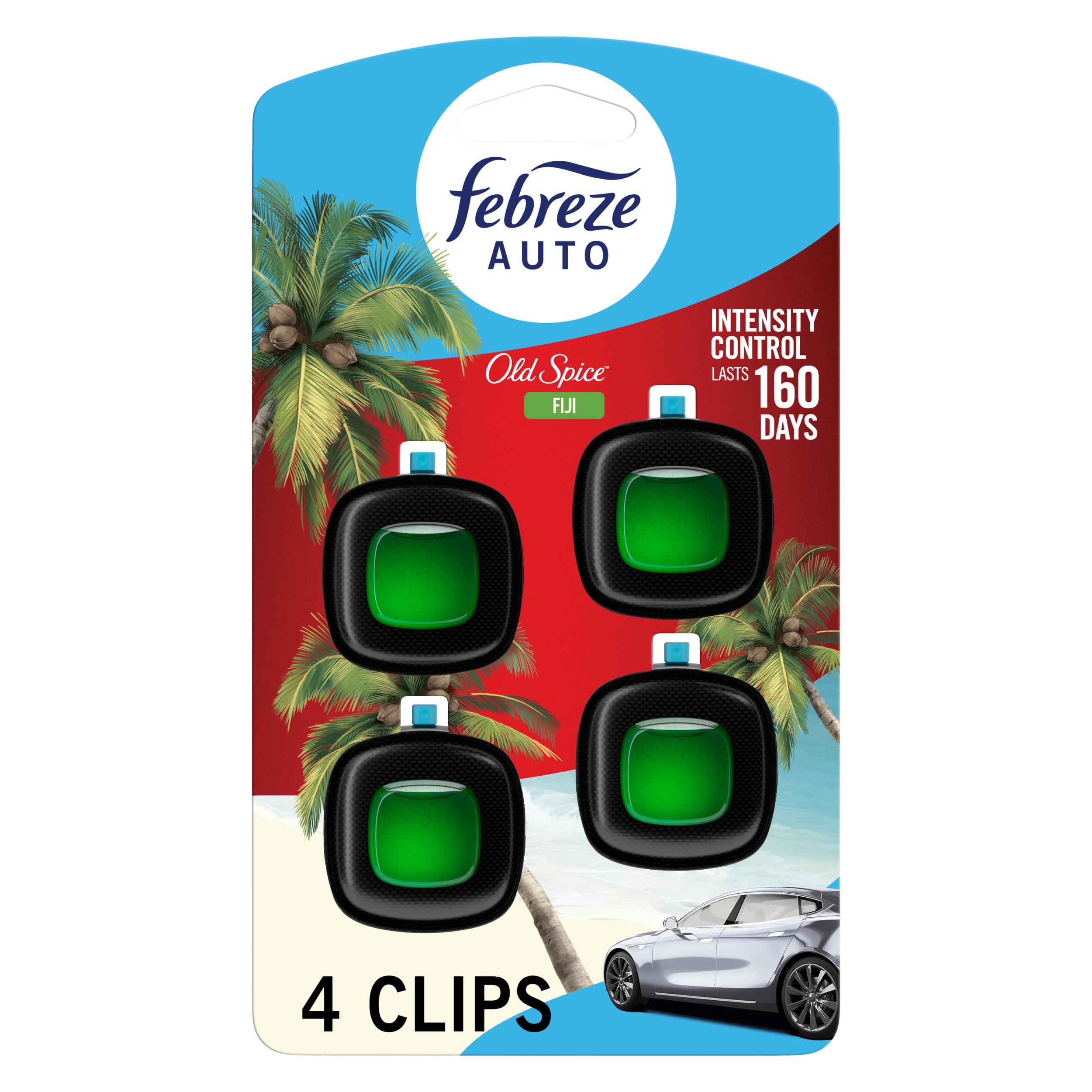 Details: Kick car odors to the curb and enjoy up to 40 days of consistent scent with Febreze AUTO. While other car refreshers start off like a floral punch in the face, Febreze smells just right, right away. You’ll get that first-day Febreze fresh for up to 40 days courtesy of its patented Steady Release Technology. This car air freshener vent clip is a breeze to install: Just unfold the clip until you hear a click, then clip it to your vent. It uses your car’s fan to circulate an even scent through your entire vehicle. With the breezy, island scent of Old Spice Fiji, your ride is now a day at the beach. These tiny car deodorizers are made with odor fighters that fight any car stink with a scent that lasts. So forget those overwhelming, fade-too-soon fresheners and enhance every drive with the long-lasting freshness of Febreze AUTO. Want a fresh that lasts at home, too? Try Febreze Fade Defy PLUG.