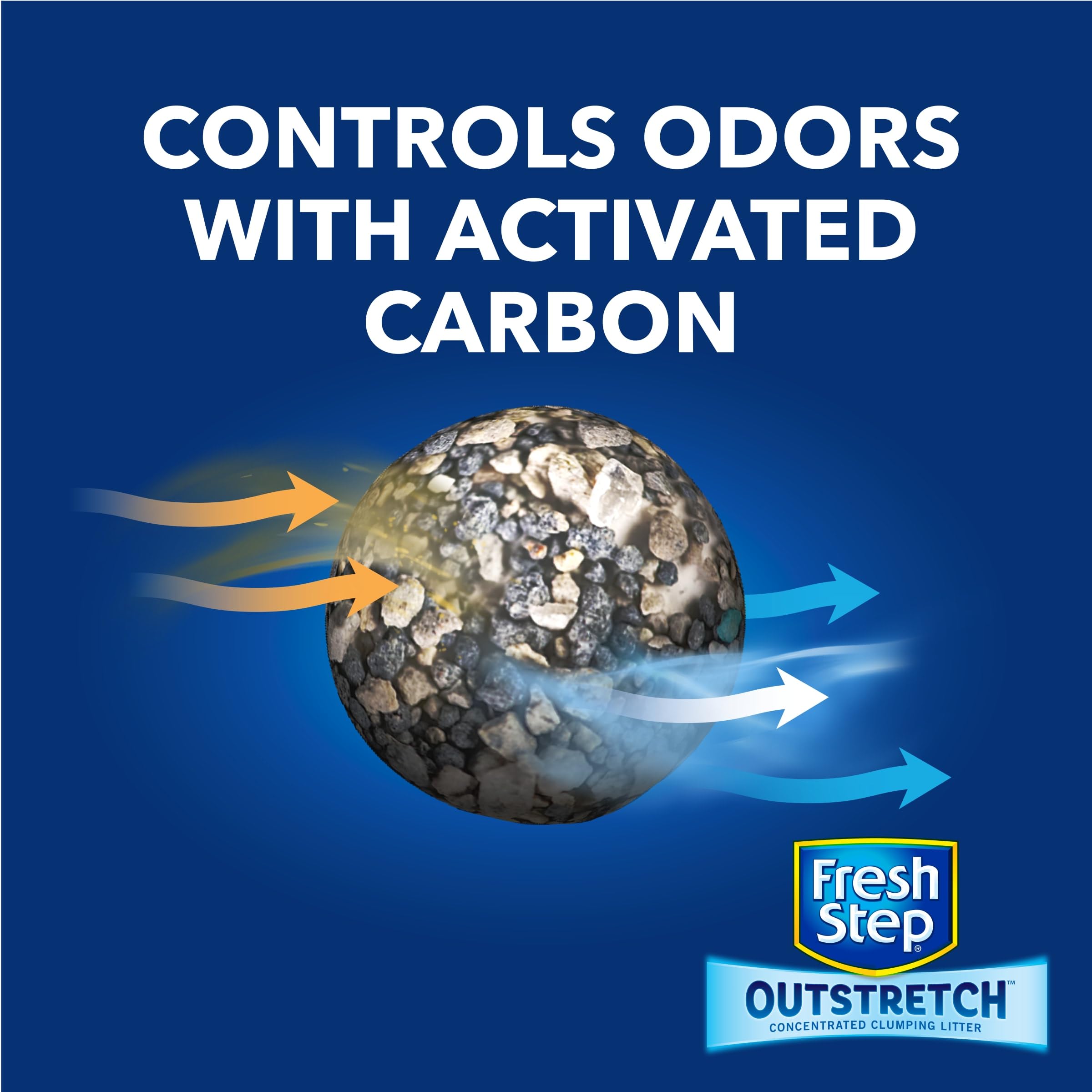 Change your litter less often* with Fresh Step Outstretch Advanced Unscented Long Lasting Clumping Litter. Innovative microgranule technology absorbs 50% more liquid waste and odor so litter lasts 50% longer*, extending time between changes. This unscented cat litter traps liquid waste at the surface to form tight clumps with less crumbles, making scooping and cleaning a breeze. 16lb of Fresh Step Outstretch lasts as long as 24lb of Fresh Step Multi Cat Litter so you can use less litter. With 6x activated carbon, this Fresh Step unscented litter controls odors for a longer period of time* and makes it easier to keep your cats litter box clean and smelling fresh. *vs Fresh Step Multi-Cat