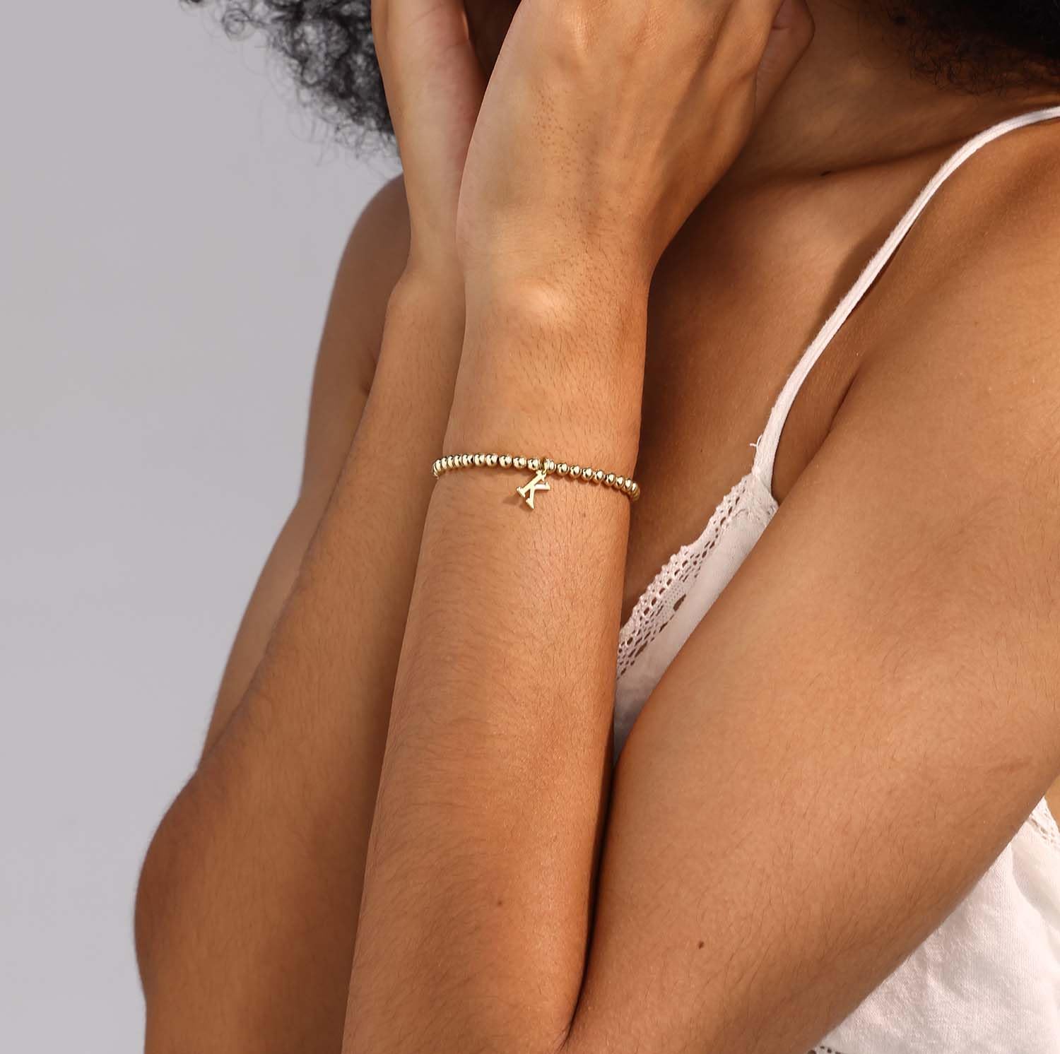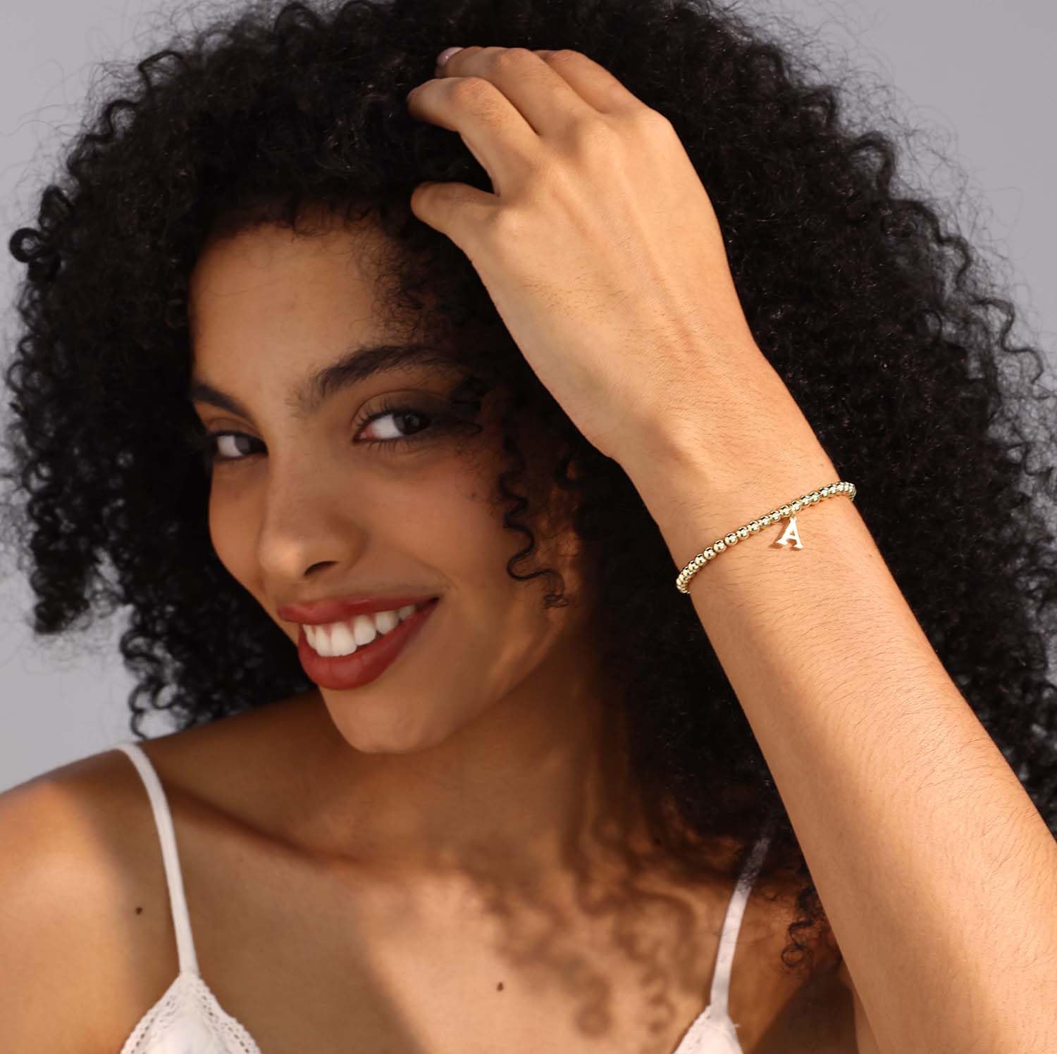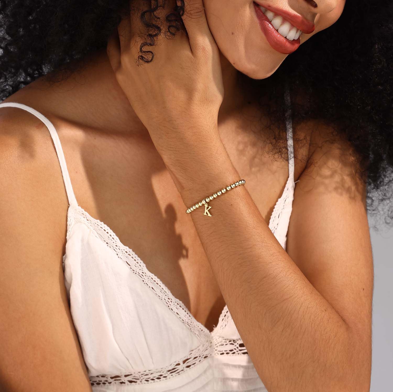 - Gold Bracelets for Women: Our initial gold beaded bracelets feature all the letters of the alphabet. Choose your own name or the name of a loved one. You can wear it alone or stack it with other bracelets.