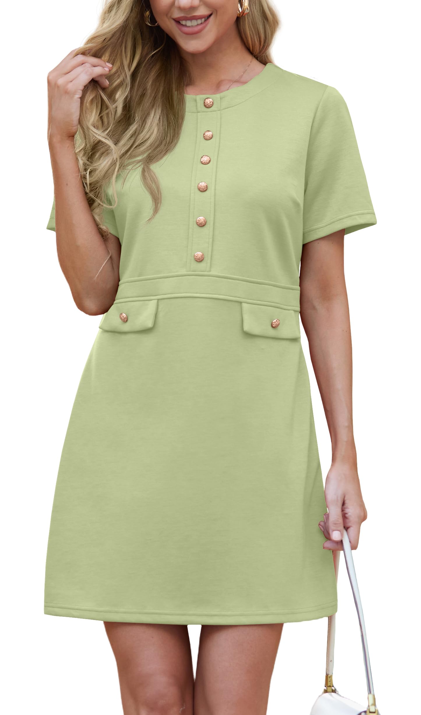 GRECERELLE Women’s Summer Short Sleeve Button Crew Neck Elegant Business Work Bodycon Mini Short Dresses Avocado Green, Medium
