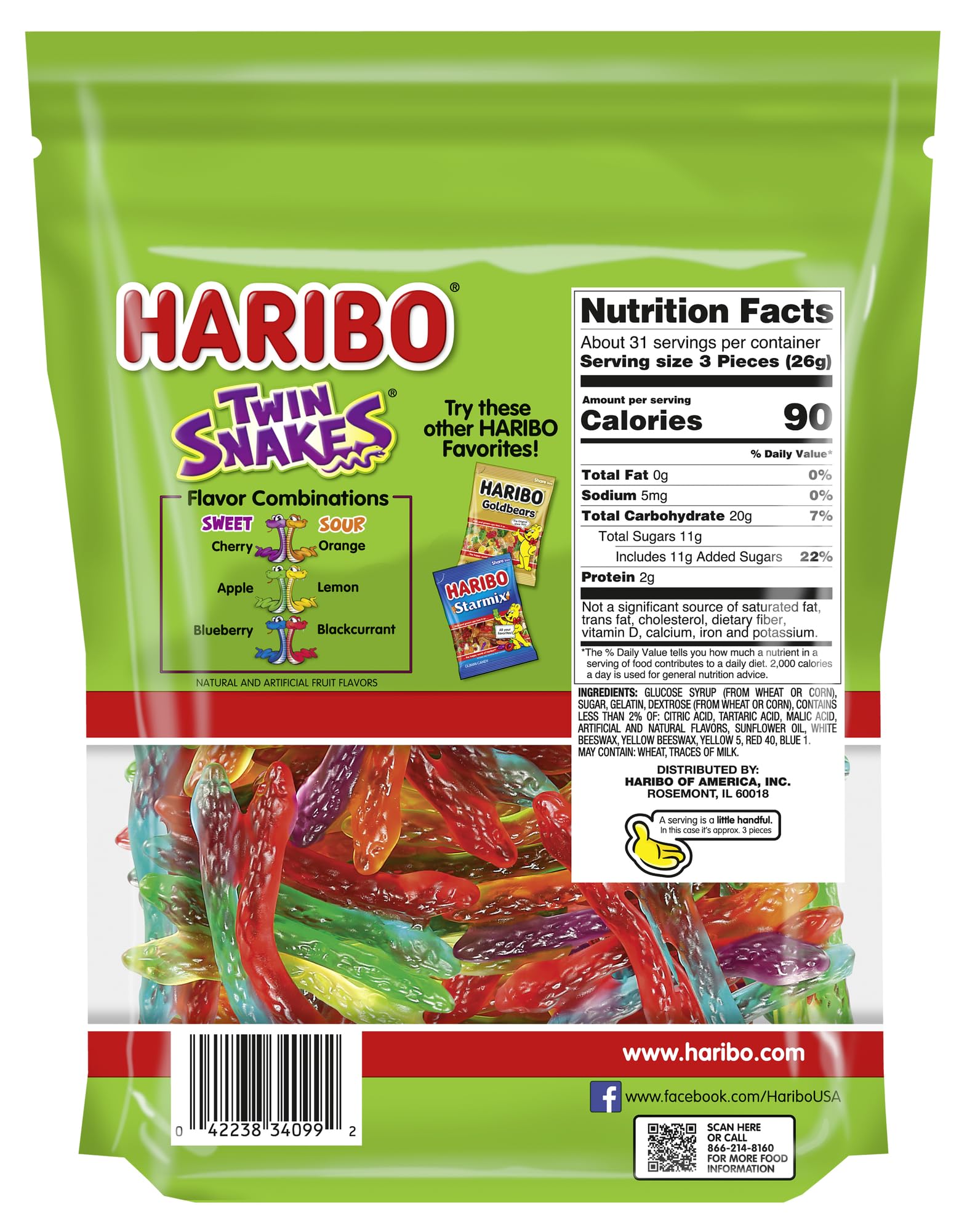 Details: HARIBO Gummi Candy, Twin Snakes Sweet & Sour Gummy Candy Experience the delightful taste adventure of HARIBO Gummi Candy Twin Snakes Sweet & Sour Gummies, a playful treat that combines the best of both worlds in taste. Each pack features closely coiled gummy snakes with two flavors, offering a thrilling combination of sweet and sour in every bite. With three delicious flavor pairings—Cherry & Orange, Apple & Lemon, and Blueberry & Blackcurrant—you can enjoy them together or pull them apart for double the fun! The soft and chewy texture of our colorful gummies is crafted to deliver a consistent, flavorful experience that will tantalize your taste buds. These sweet and sour treats, with just 90 calories per serving, are great for sharing, snacking, or adding a fun twist to your desserts and party candy favors. From a small sweets company to a global market leader, the HARIBO brand started as a humble home kitchen. Over the past 100 years we have grown to a successful family business. Kids and grown-ups love it so, the happy world of HARIBO!