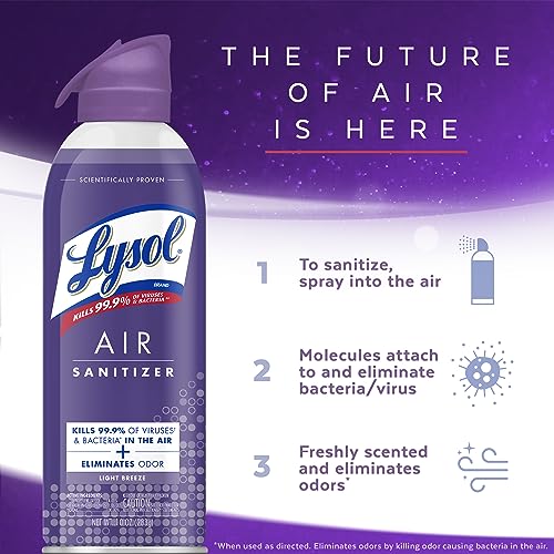 - SANITIZE THE AIR THROUGHOUT YOUR HOME: Lysol Air Sanitizer Spray sanitizes and eliminates 99.9% of odor causing bacteria* in the air. Enjoy the scent of a light breeze. (*Use as directed).