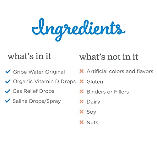 • Collection of four of our most popular wellness products: Our Gripe Water and Gas Relief Drops to help calm tummy troubles*, Vitamin D Drops to promote healthy growth*, and Saline Drops to help with sniffles