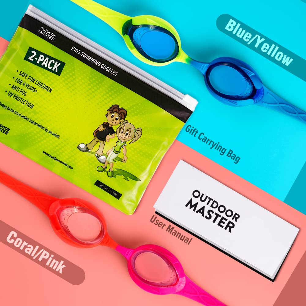 - WHAT YOU GET – 2 x OutdoorMaster Kids Swimming Goggles, User Manual, Cute Gift Carrying Bag & our CUSTOMER-FAVORITE LIFETIME WARRANTY and friendly customer service.