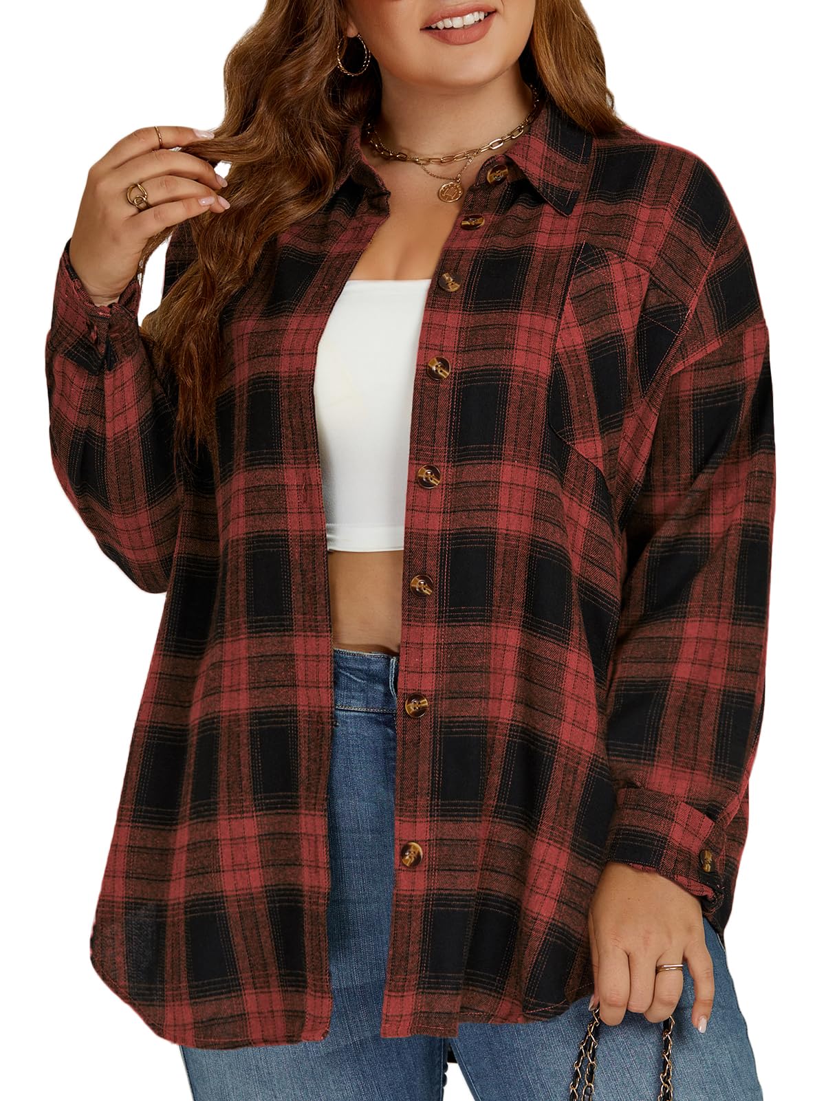 Plus Size Tops for Women Cute Winter Long Sleeve Shirts Fashion Plaid Tunics Loose Fit Flannel Blouses XL Black&Red