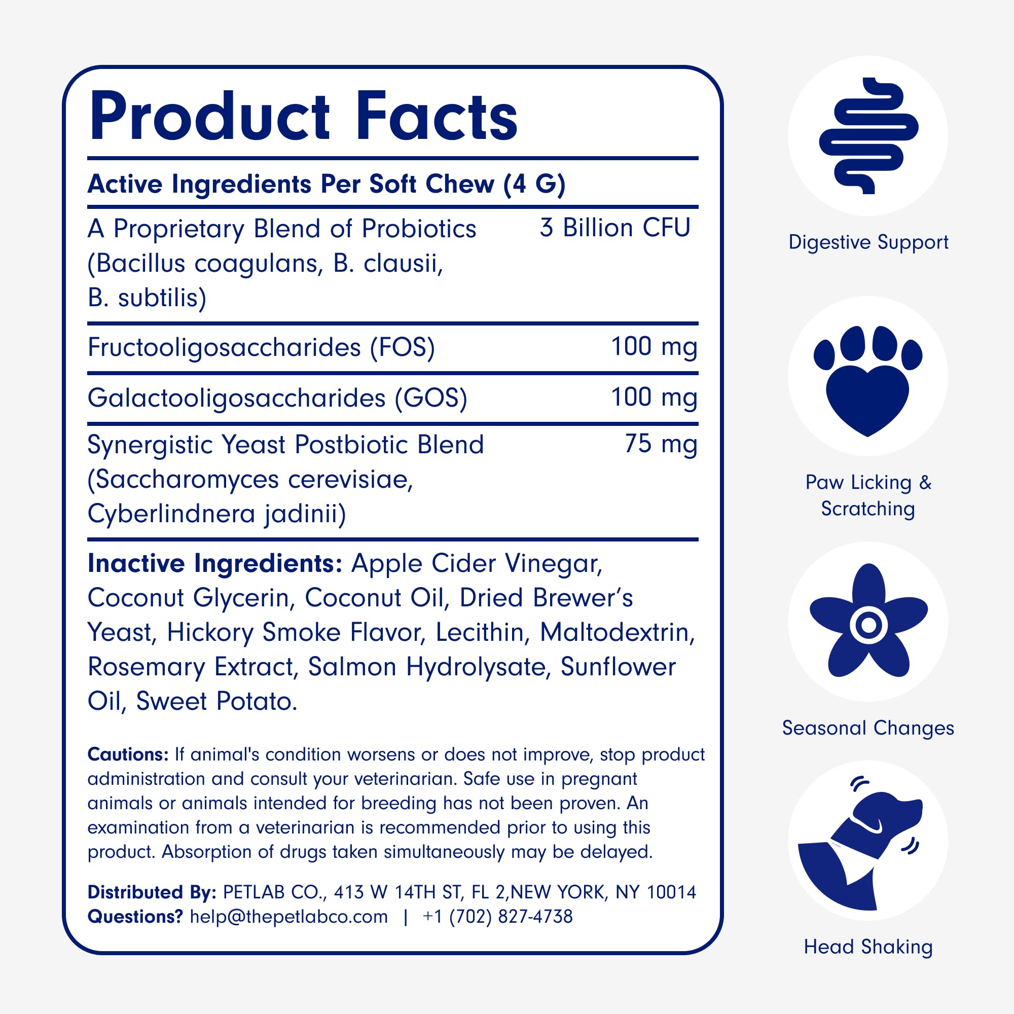 - Support for Paw Licking, Itchy Skin & Healthy Yeast Levels: Each tasty probiotic chew is formulated with prebiotics and probiotics. Including 8 strains of beneficial bacteria to support the immune system and dog’s seasonal allergies