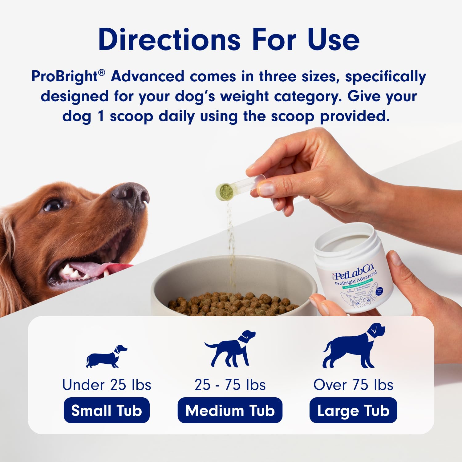 - Easy To Use – Choose the right formula for your dog’s size (Small, Medium, Large) and add one scoop using the scoop provided in the tub to their food daily. For dry kibble, moisten the food before sprinkling the powder