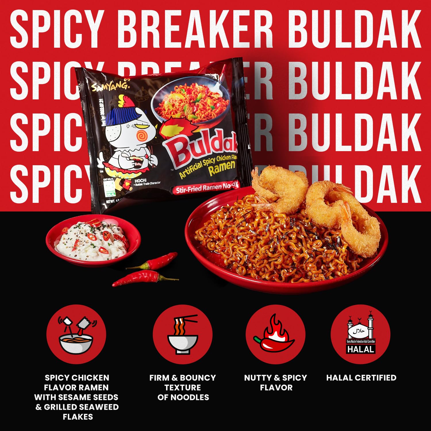 - ADDICTIVE SPICY CHICKEN FLAVOR RAMYUN – The most representative hot spicy stir-fried ramyun, loved by the whole world. It is the best-selling product to enthusiasts who love spicy taste. Spicy but delicious, be ready to be addicted.