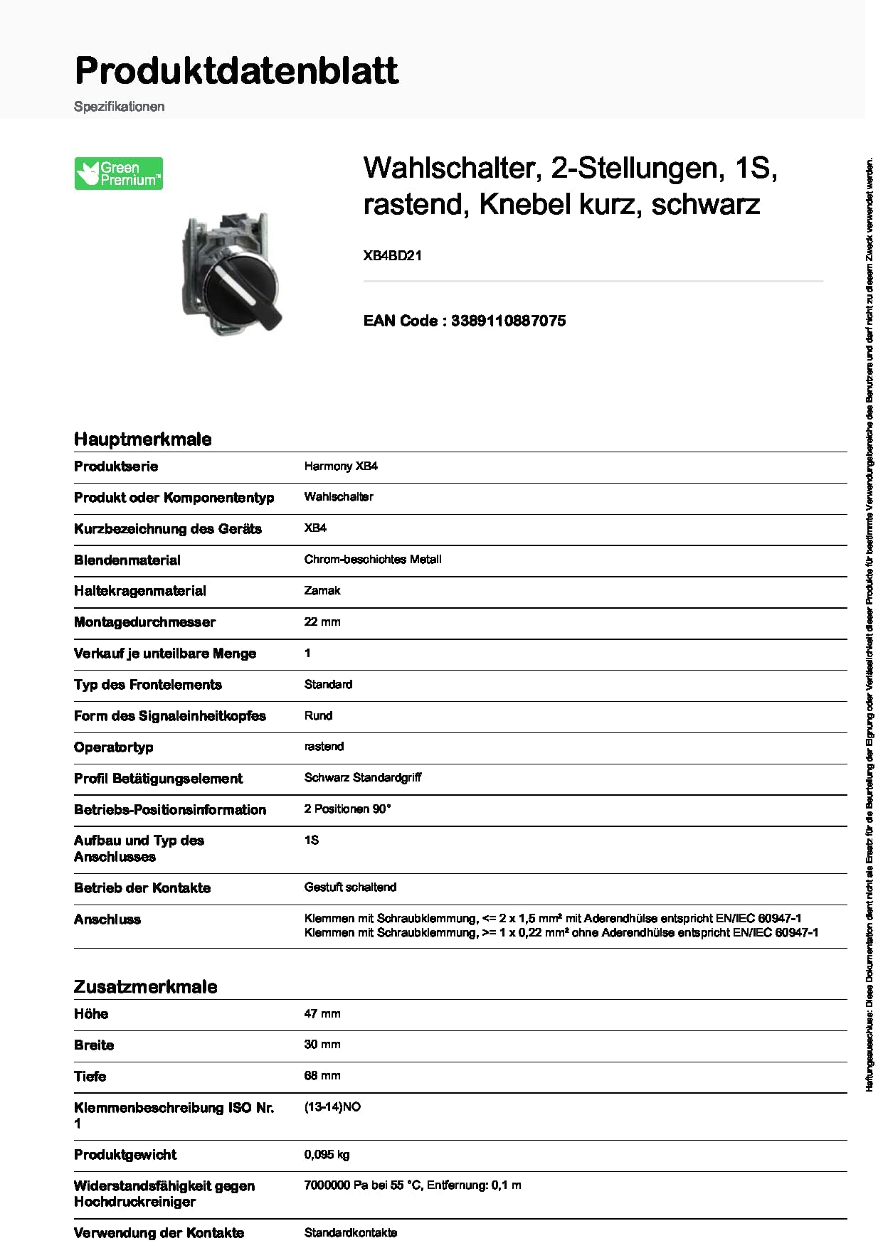 Schneider Electric XB4BD21 Harmony XB4 Selector Switch for Industrial Machinery with Metal Bezel, 2 Positions, Stay Put Operation, 1NO