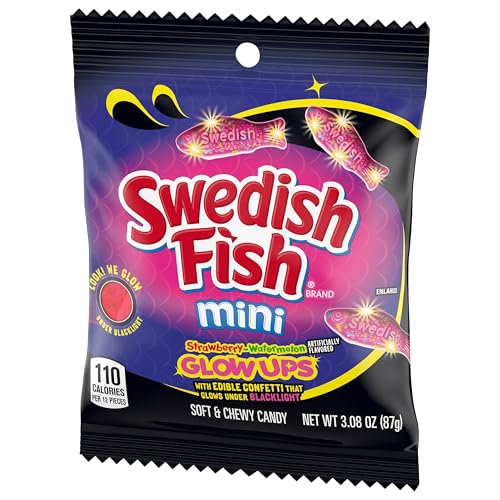 Details: Shine a light on your next snacking session with SWEDISH FISH Mini Glow Ups Strawberry-Watermelon Soft & Chewy Candy. These fun, fish-shaped candy gummies feature edible confetti that glows under blacklight and a sweet strawberry-watermelon flavor that delights your taste buds with every chewy bite. The edible confetti in this unique candy contains turmeric extract, which gives it its fun glow (Hint: You cannot taste it). The first-ever gummy candy fish that glows, SWEDISH FISH Mini Glow Ups are a must-try for fans of bold, adventurous candy experiences. Serve this playful pink candy at your next blacklight party, pack it as a crowd-pleasing snack for a concert or music festival, or simply enjoy it as a fun, satisfying treat during movie nights and gaming marathons. Whether you’re solo snacking at home or sharing with friends, these glowing gummy candies light up any occasion. This bagged candy is a great pantry snack for tossing in your backpack so you can take these show-stopping gummy snacks on the go. Each bag of candy offers enough for a single event or to enjoy over time, and with this bulk candy case of chewy, sweet candy, you’ll be ready for any snacking occasion. Brighten your day with SWEDISH FISH Mini Glow Ups Strawberry-Watermelon Candy.