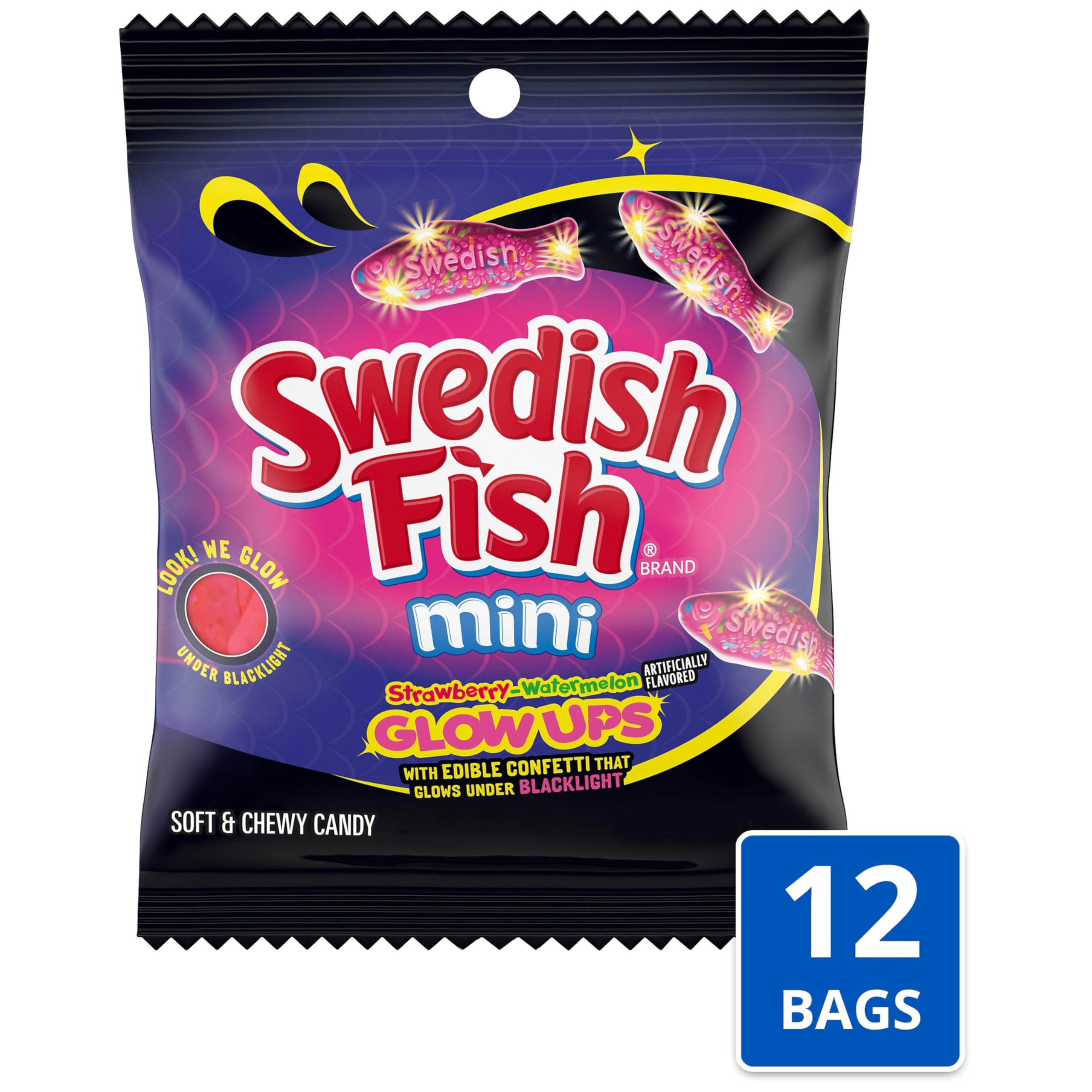 • Twelve 3.08 oz bags of SWEDISH FISH Mini Glow Ups Strawberry-Watermelon Soft & Chewy Candy