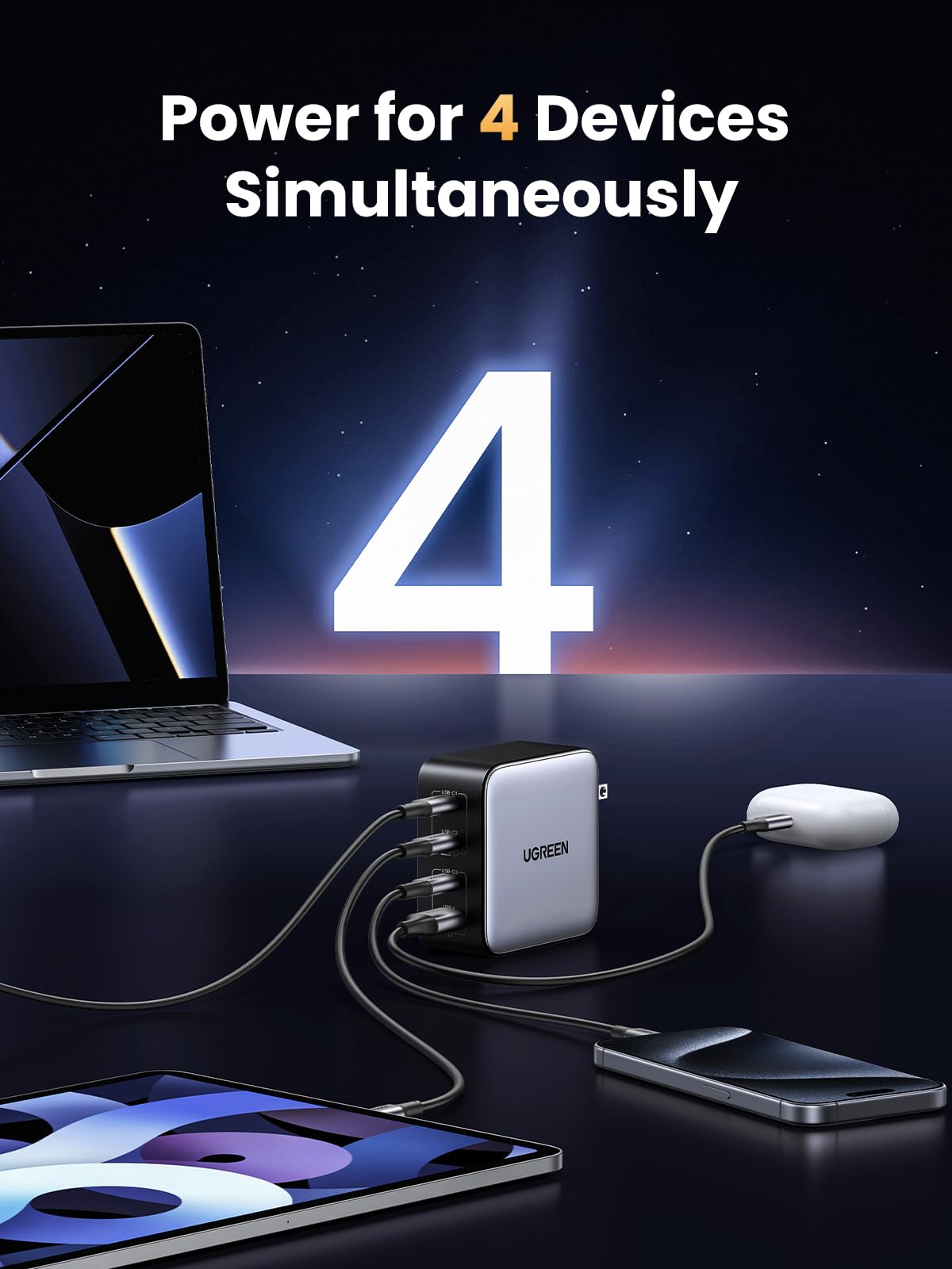 - 4 In 1 Multiport charger: 3 * USB C ports and 1 * USB A port provide 100W to phones, tablets, laptops, and other devices, all at the same time fast charging